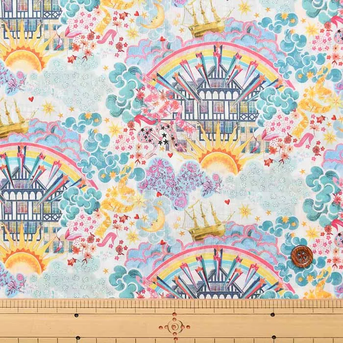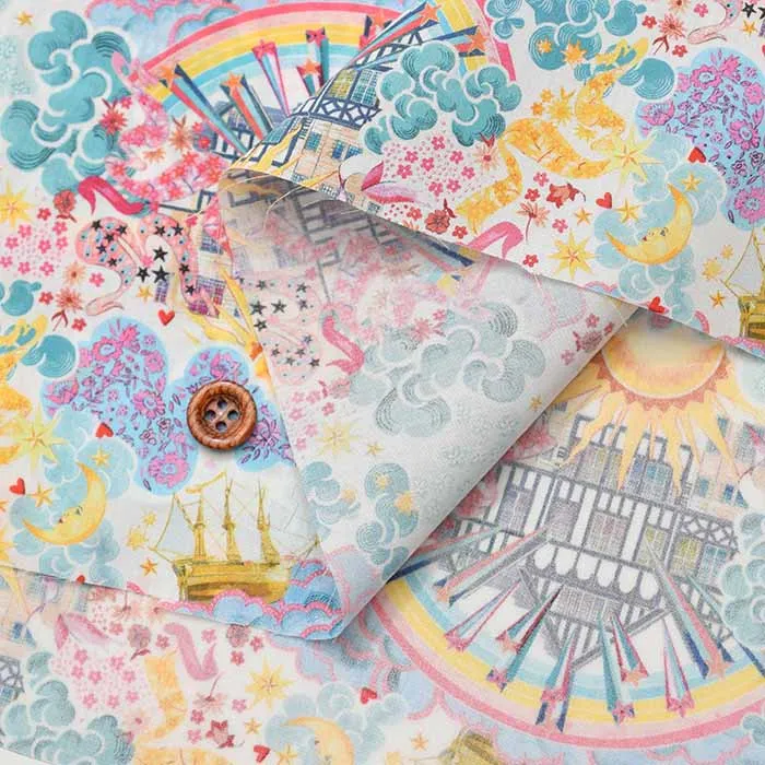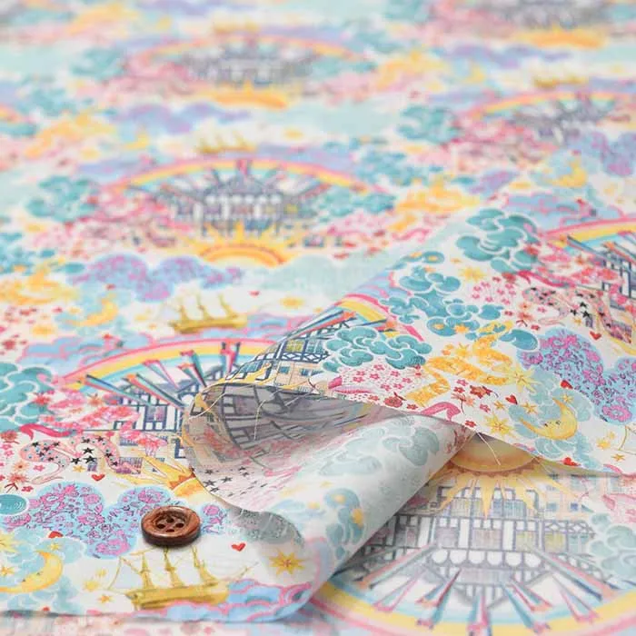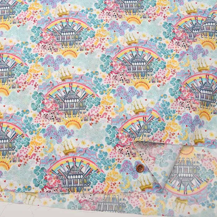 リバティの象徴的なビルを祝福し、装飾的な花の雲に囲まれ夢のような空の中にチューダー様式のファサードをガッシュで手描きしました。窓からは星がはじけ、スカーフが流れ、輝く太陽と鮮やかな虹が楽しい祝祭に華を添えています。