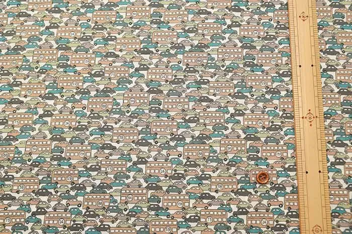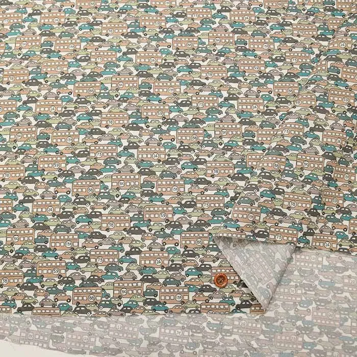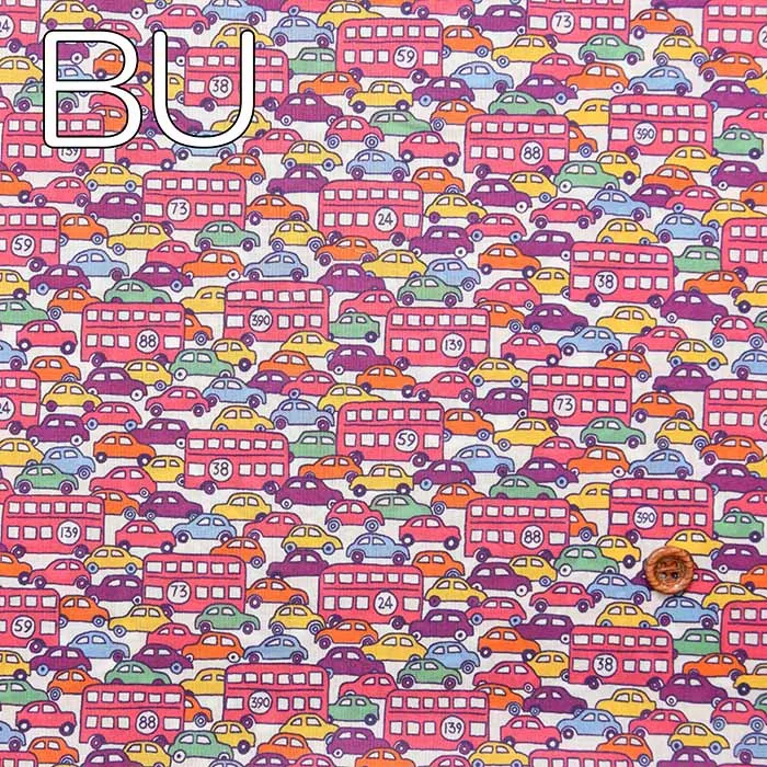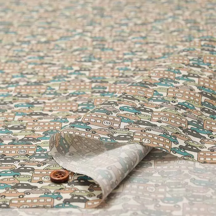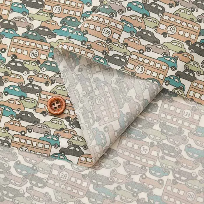 人気のカンバセーショナルデザイン「カーズ」をアップデートしたデザインで、究極の交通渋滞を表現し格子状に並んだ1950年代風の車とバスが描かれています。大人向けだと風変わりなレトロなパターンに、子供向けには生意気なデザインです。1971年に初めてデザインされて以来、リバティではこの楽しいデザインのバリエーションが何年も作られています。