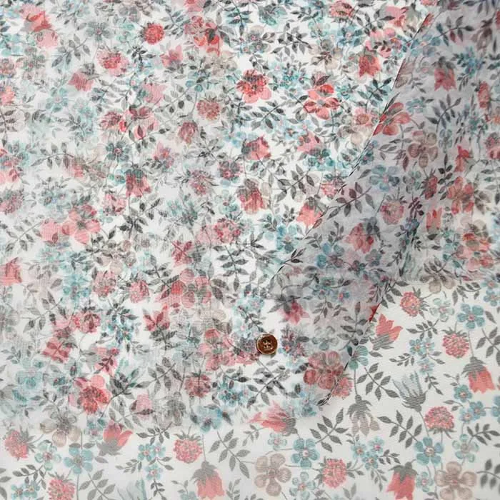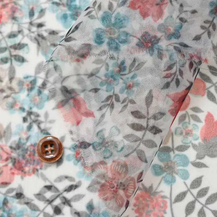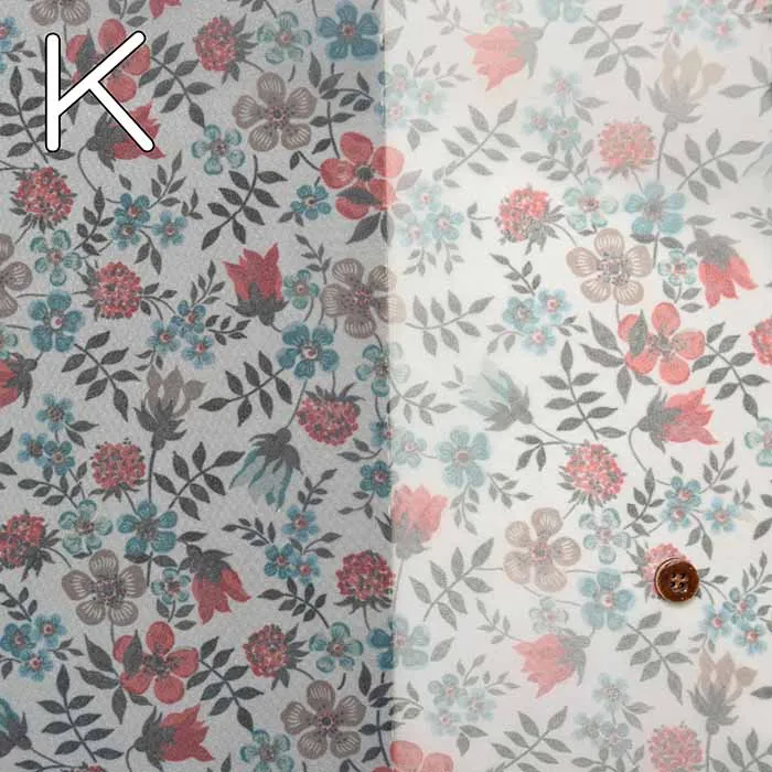 リサイクルPET繊維を使用した、サンコロナ小田オリジナルの「リサイクルポリエステルオーガンジー」に、リバティジャパンとしては初めて「転写プリント」を用いた、水を使わず汚水を出さない、環境配慮型の新たなサステナブル素材となっております。