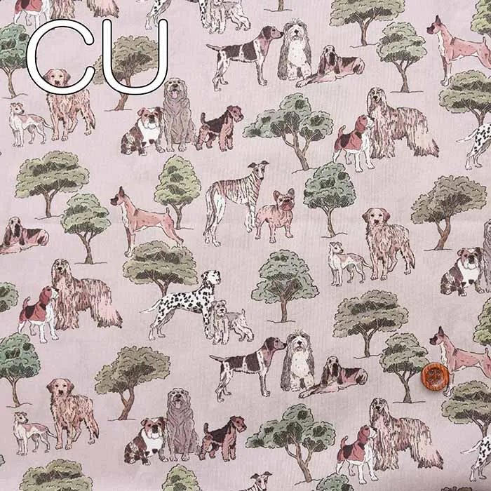 ロンドンのハイドパークの緑豊かな木々の中で、雄大な犬が朝の散歩を楽しんでいます。ブルドッグ、ウェルシュ・テリア、ラブラドール、ダルメシアン、ボクサー、オールドイングリッシュ・シープドッグ、アフガン・ハウンド、ブラッドハウンド、ビーグル、シュナウザー、ゴールデン・レトリバー、ポインター、グレーハウンドなど、さまざまな種類の犬が描かれています。リバティのデザインスタジオでペンとインクで描かれたモチーフは、デジタルで着色され、大胆な下地が加えられています。