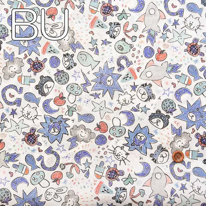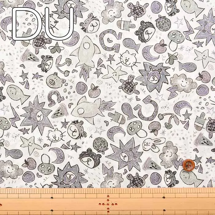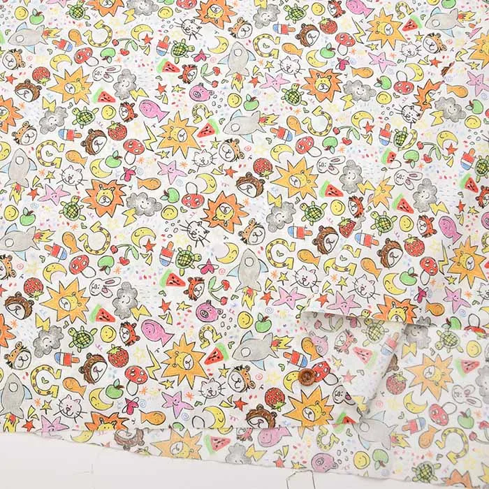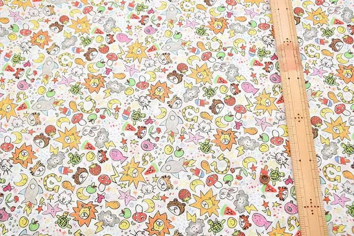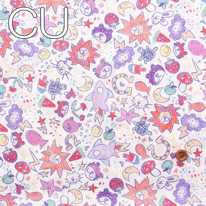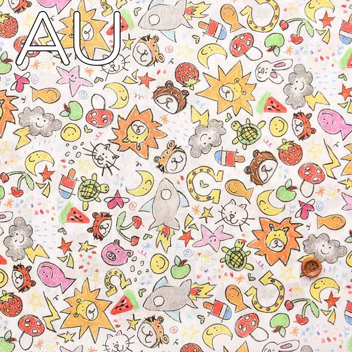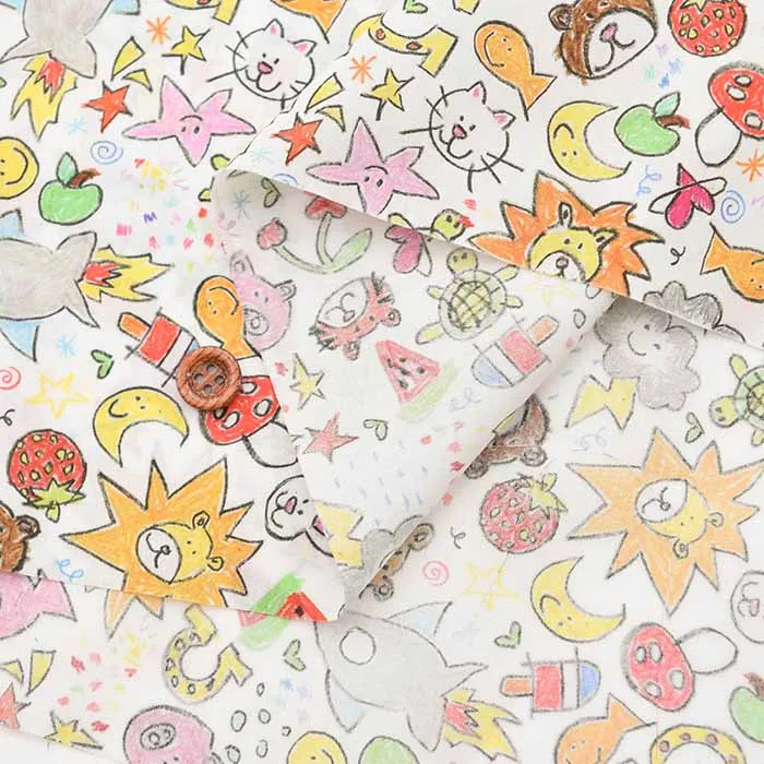 子供のシールコレクションからインスピレーションを受け、スタジオでクレヨンを使って描かれた「オデット」。遊び心にあふれたこのデザインが、微笑む動物たちが飛び回る宇宙船やジューシーなフルーツと一緒になって、あなたを想像の世界へと誘います。