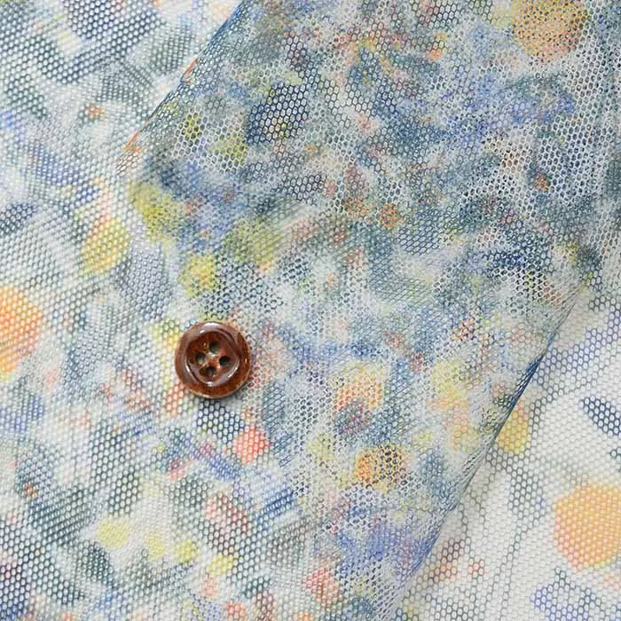 リサイクルPET繊維を使用した、サンコロナ小田オリジナルの「リサイクルポリエステルチュール」に、リバティジャパンとしては初めて「転写プリント」を用いた、水を使わず汚水を出さない、環境配慮型の新たなサステナブル素材となっております。