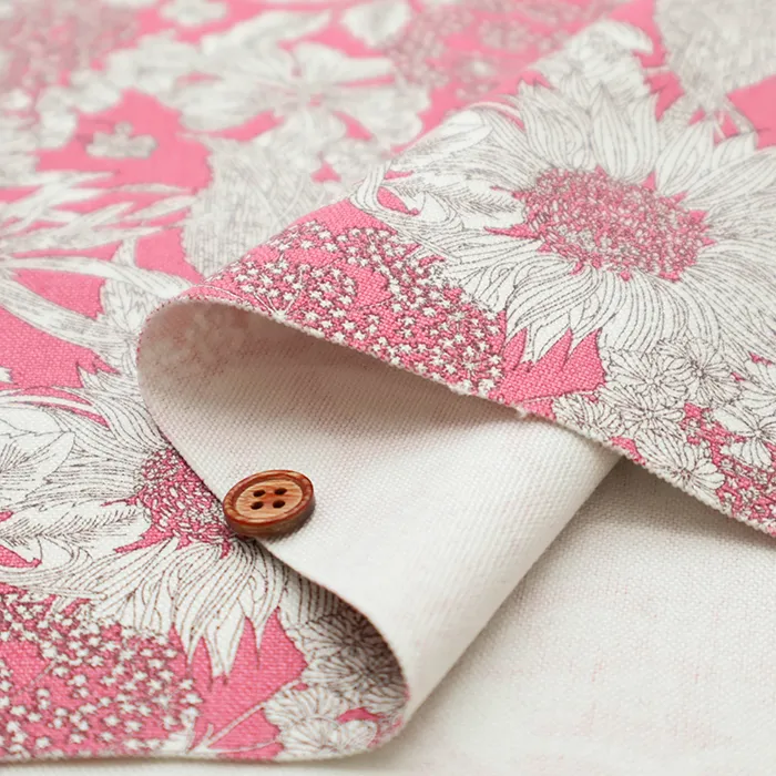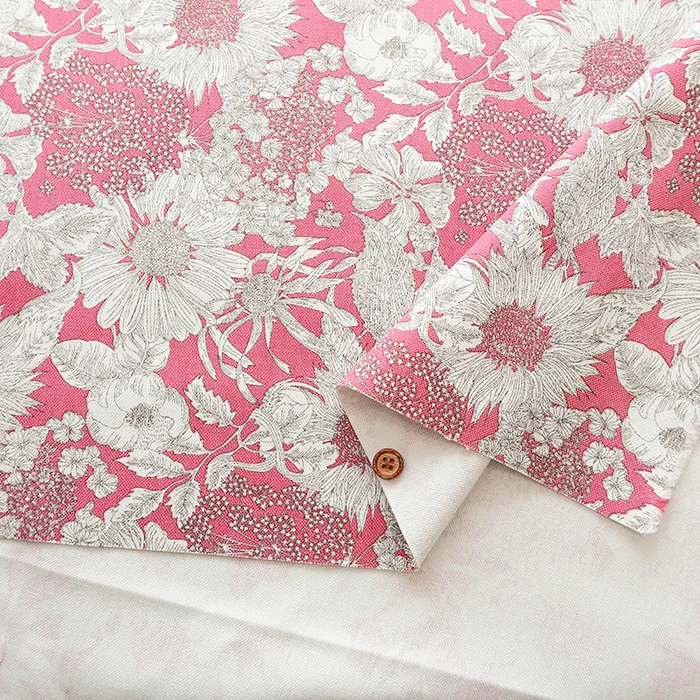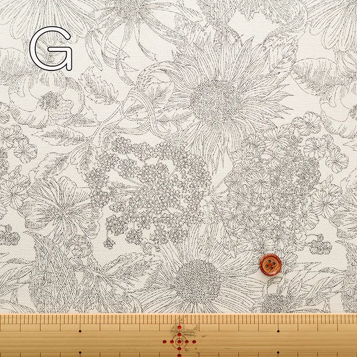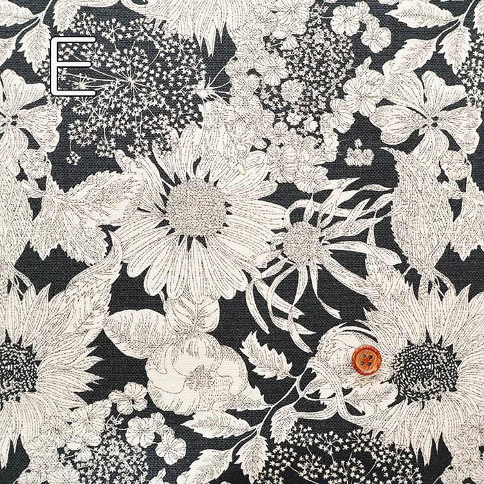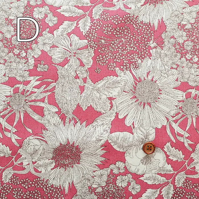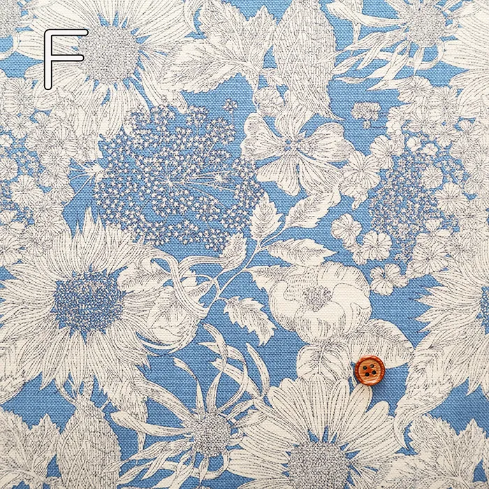 2009年シティポプリン用にリバティ社のデザインスタジオで作成された「ダンクレア」を元に、2012年春夏にスウィムコレクションで「スイム・ダンクレア」としてリドローされた一柄を元にしています。今回はその「スイム・ダンクレア」を縮小し使いやすくしました。向日葵、ゼニアオイ、アンゼリカ、ヒナギク、シャクヤク、紫陽花等が力強く描かれたデザインです。