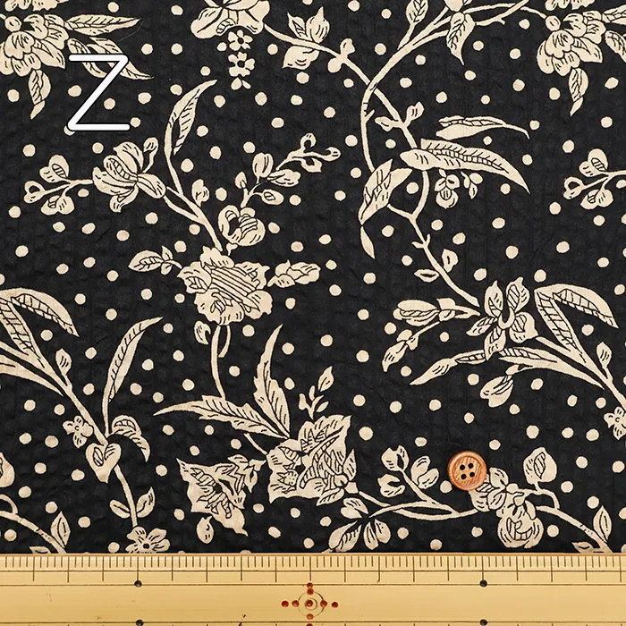 このモノクロのデザインは元々、1990年秋冬と1991年春夏のシーズナルコレクションでビスコースのためにデザインされました。水玉のベースデザインに手描きで、東洋の花々が上に向かってレイアウトされた柄です。