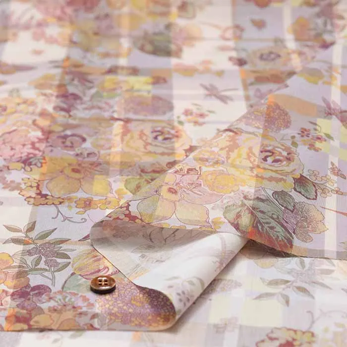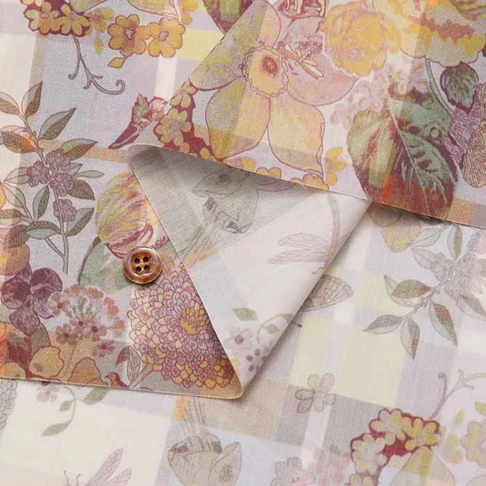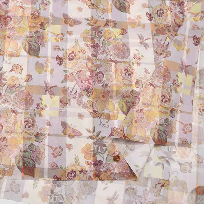2011年にリバティのデザインスタジオで描かれたオリジナルデザインに、同系色のチェックを背景に取り入れることでより魅力的なデザインになりました。この魅惑的なフローラル・カンバセーショナルデザインは、ヴィンテージ・ローズ、マリーゴールド、フクシア、パンジー、チューリップ、水仙、サクランボ、トンボ、蝶々で飾られたノスタルジックなブーケなど、大切な子供時代のイメージをデコパージュしています。