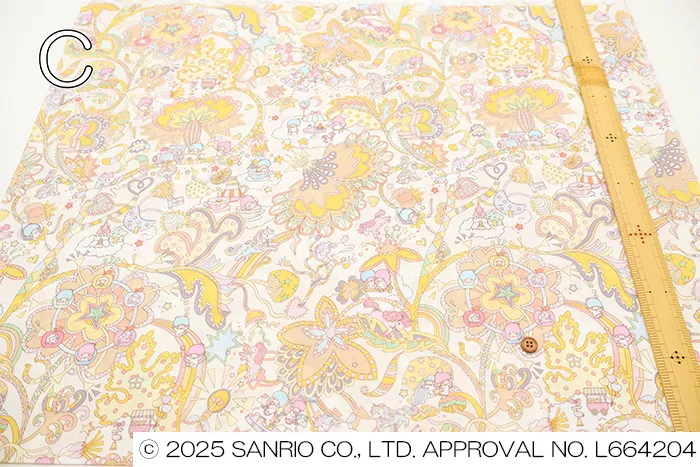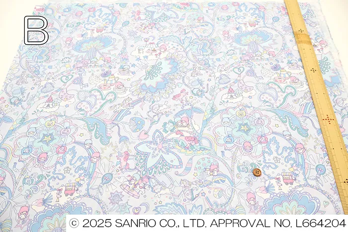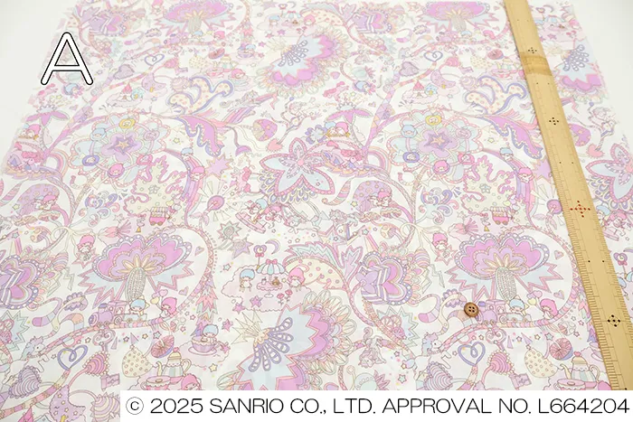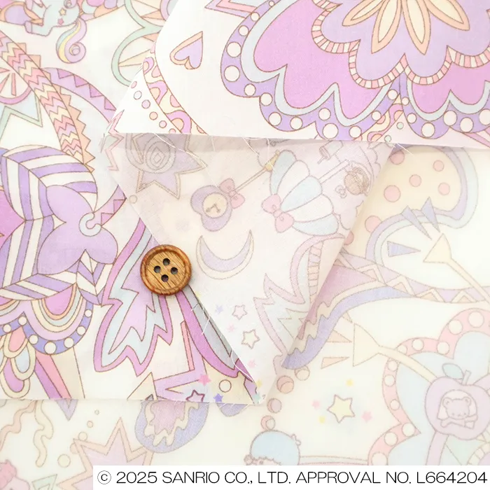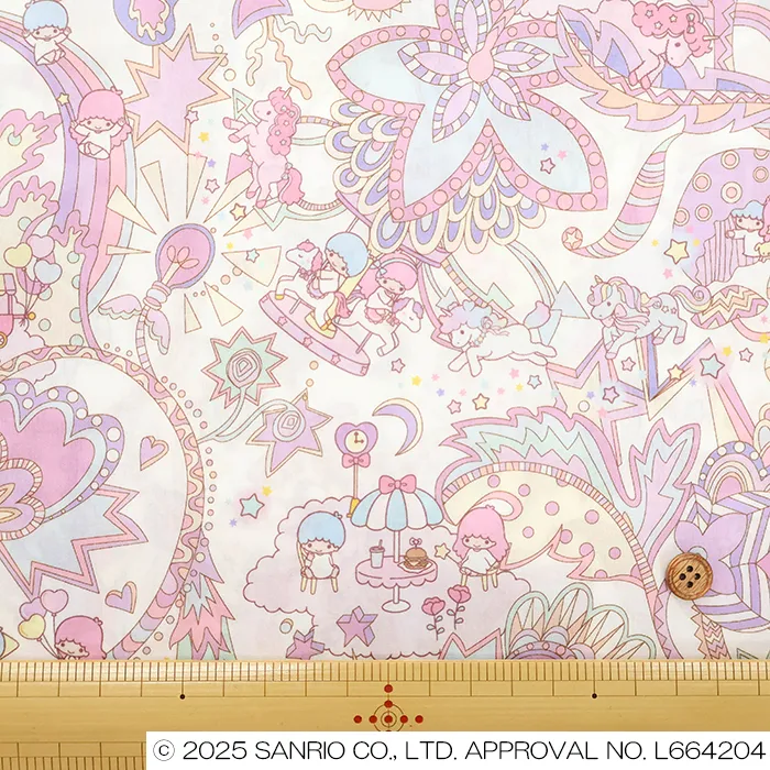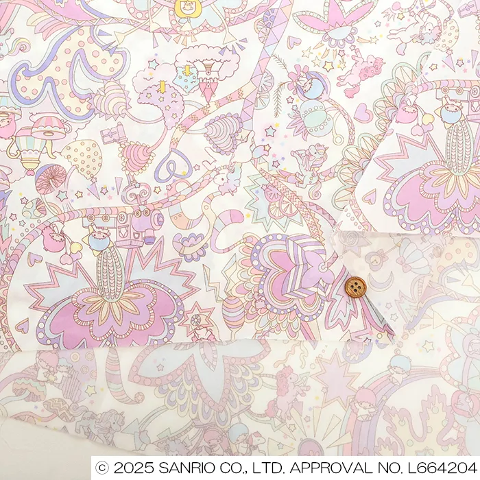 リトルツインスターズとその仲間たちが魅力と驚きに満ちた世界を探検する、植物のワンダーランドを描いたデザインです。遊園地での楽しい一日を思わせるように、彼らは眩い花の蔓の間を歩き回ります。ティーカップ・星・鍵・電球・風船・列車・メリーゴーラウンド・キノコ、そしてポップコーンマシンまで、多彩なモチーフがあちこちに顔をのぞかせ、好奇心と遊び心あふれる発見へと誘います。