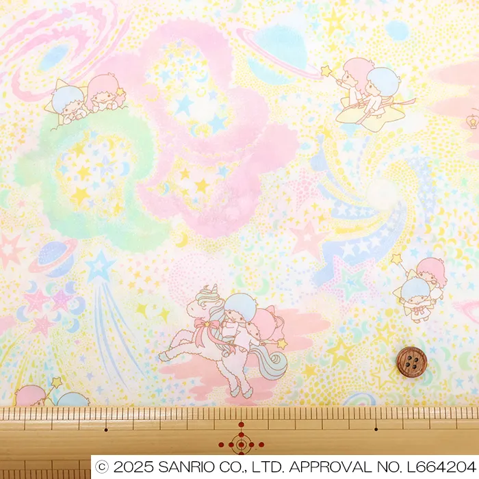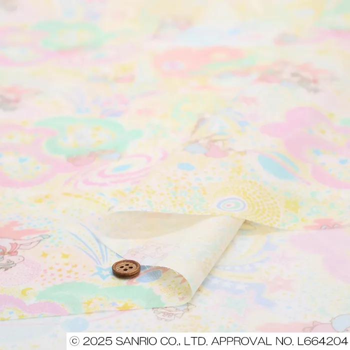 輝く彗星や光る月、踊る惑星、渦巻く彗星のきらめきや月の光、惑星のリズム、銀河のうねりが重なり合い、キキ&ララの夢のような宇宙の旅を美しく表現しています。ユニコーンに乗り、高く舞い上がる二人は、光と動きに満ちた果てしない宇宙を飛び回ります。繊細なラインで手描きされた原画に、水彩の柔らかな色調を重ねた、リバティらしい幻想的なデザインです。