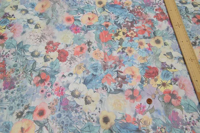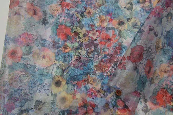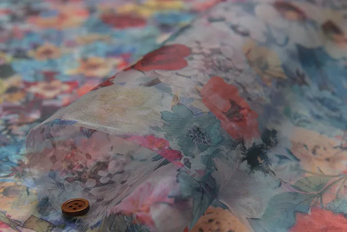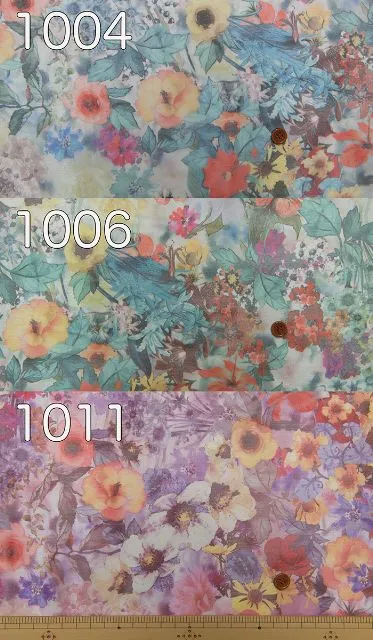 ハリのあるオーガンジー生地に、色鮮やかな配色でプリントしている生地です。