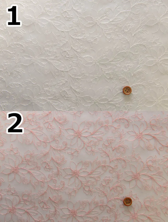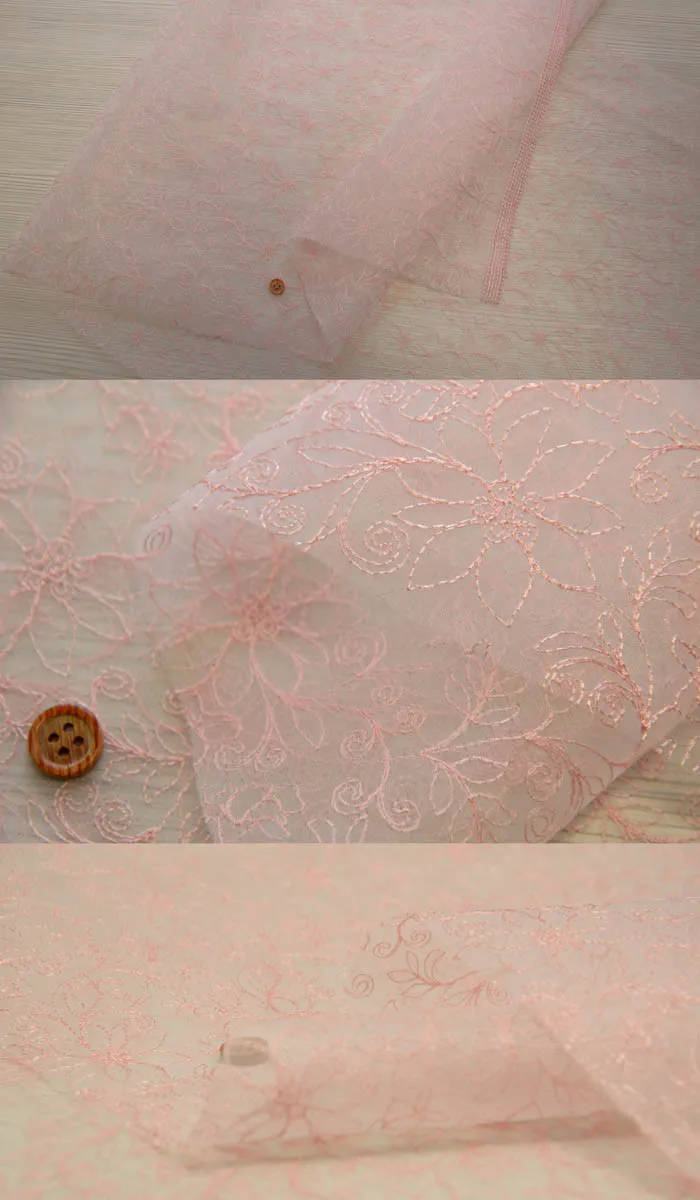 透け感があり、ハリもあり、衣装やドレスなどでよく使われるオーガンジーに光沢のあるレーヨン糸でレースを施した、上品な生地です。