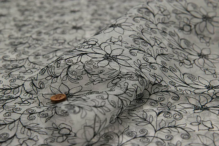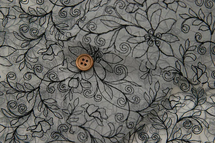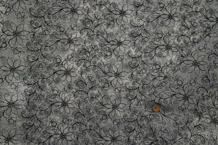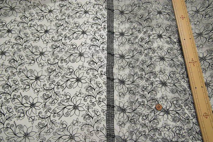 透け感があり、ハリもあり、衣装やドレスなどでよく使われるオーガンジーに光沢のあるレーヨン糸でレースを施した、上品な生地です。