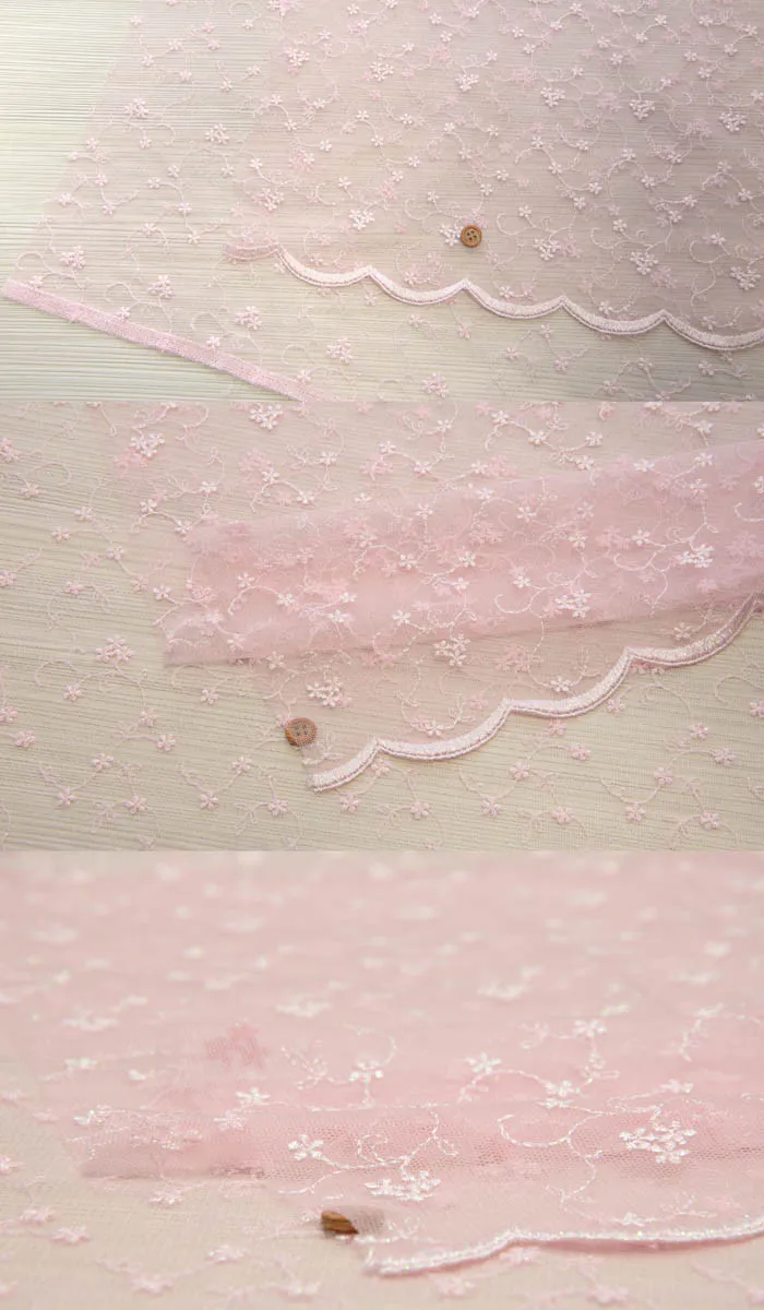 伸縮性があるため、ドレープ性に優れたストレッチチュール生地に光沢のあるレーヨン糸で刺繍を施した、ドレス等にぴったりの上品な生地です。