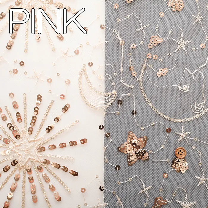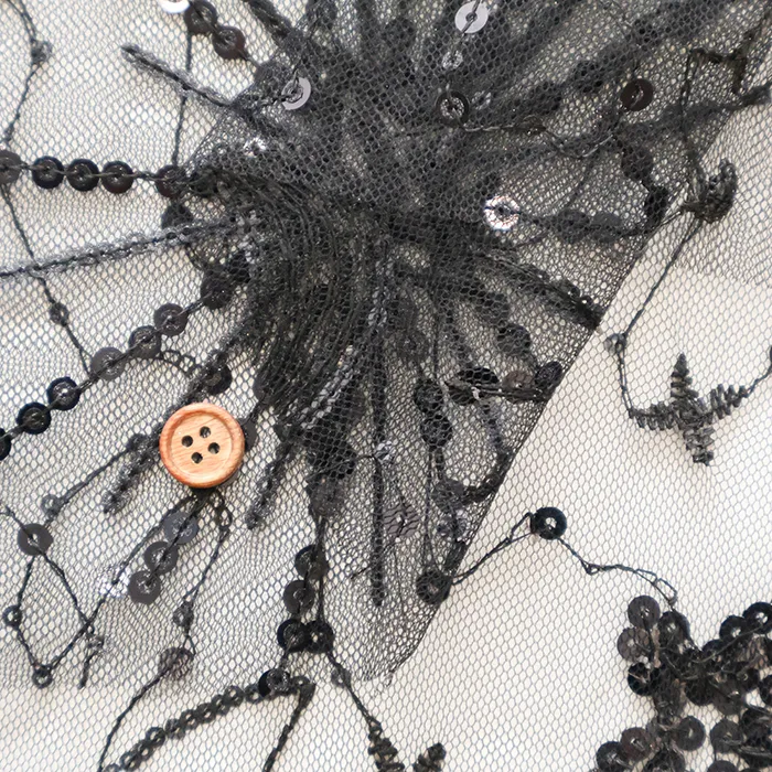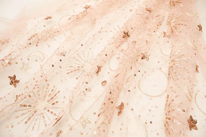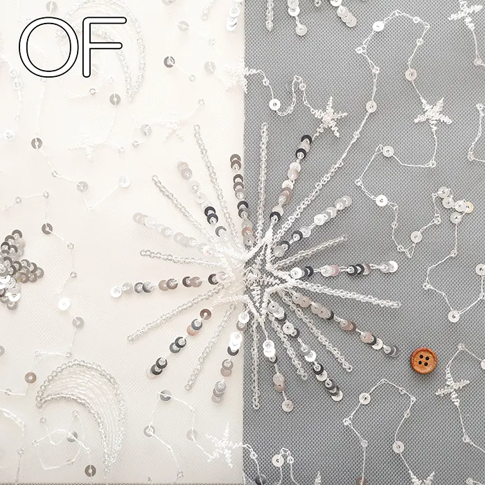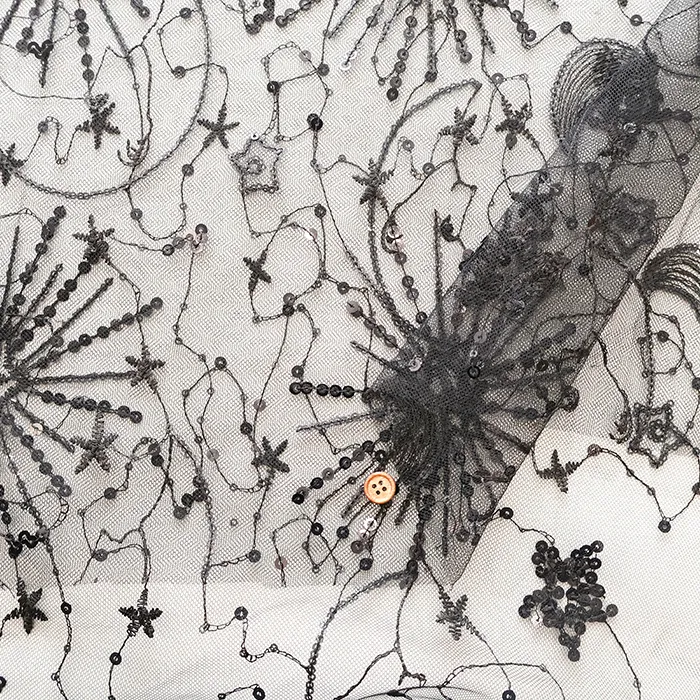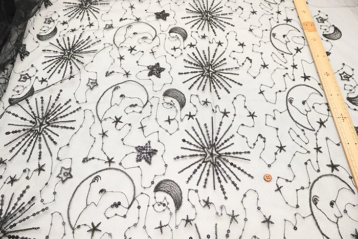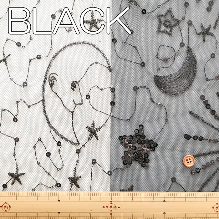 チュール生地に、星や月が刺繍されスパンコールが縫い付けられた煌びやかな生地です。