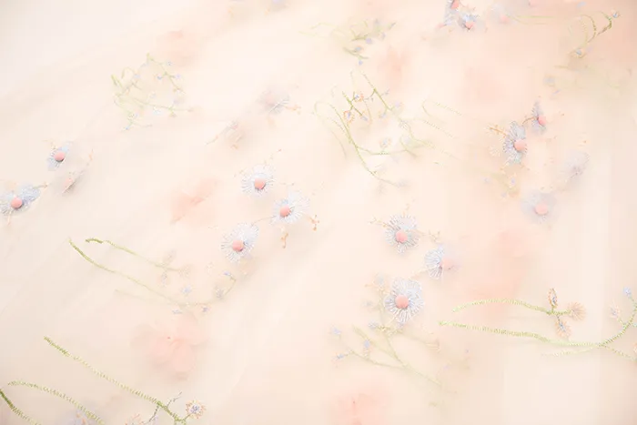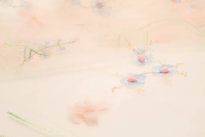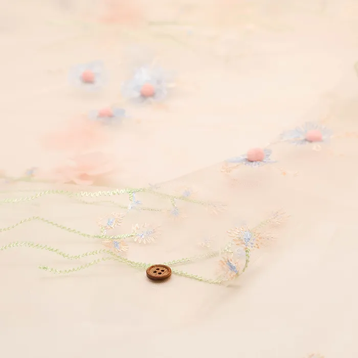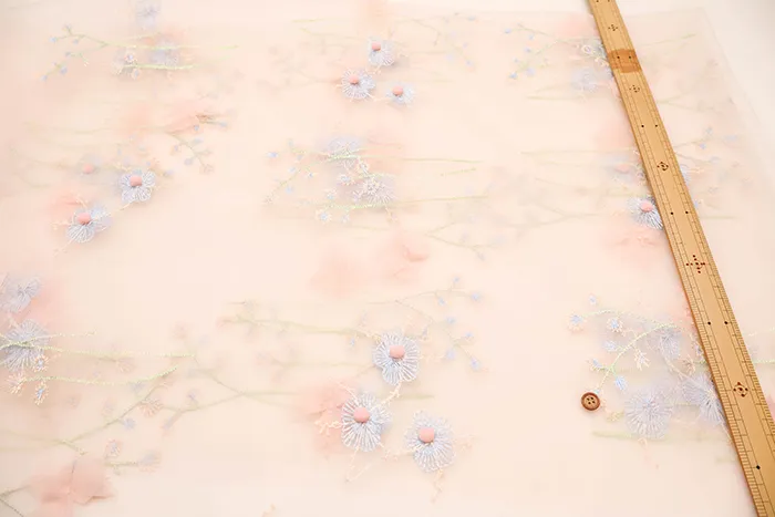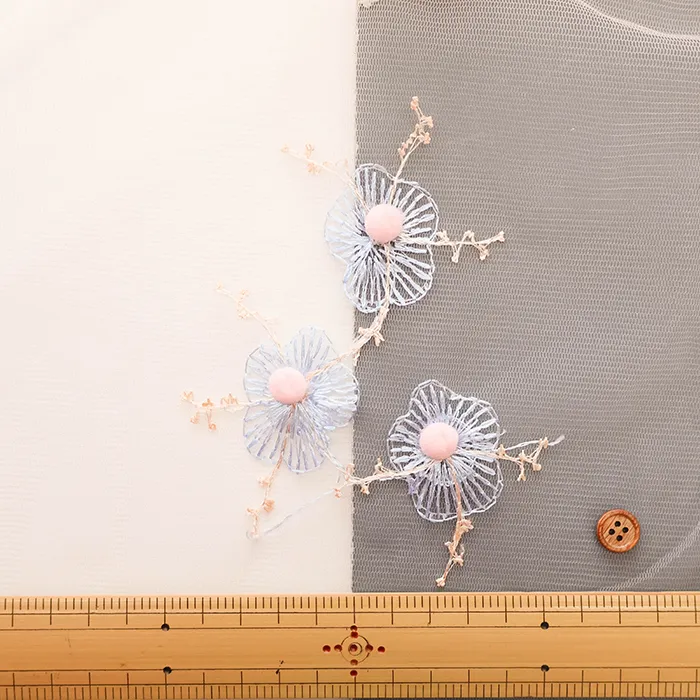 チュール生地に花柄の刺繍、立体的なポンポンとお花がついた素敵な素材です。