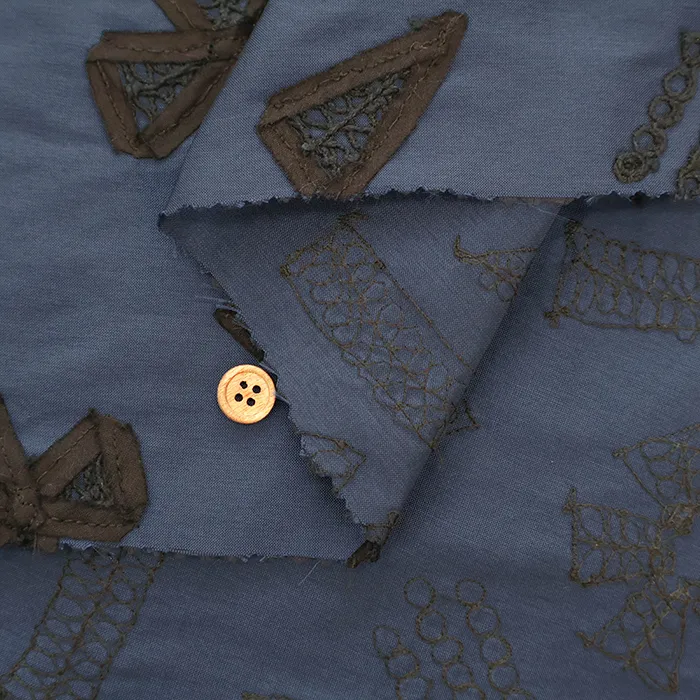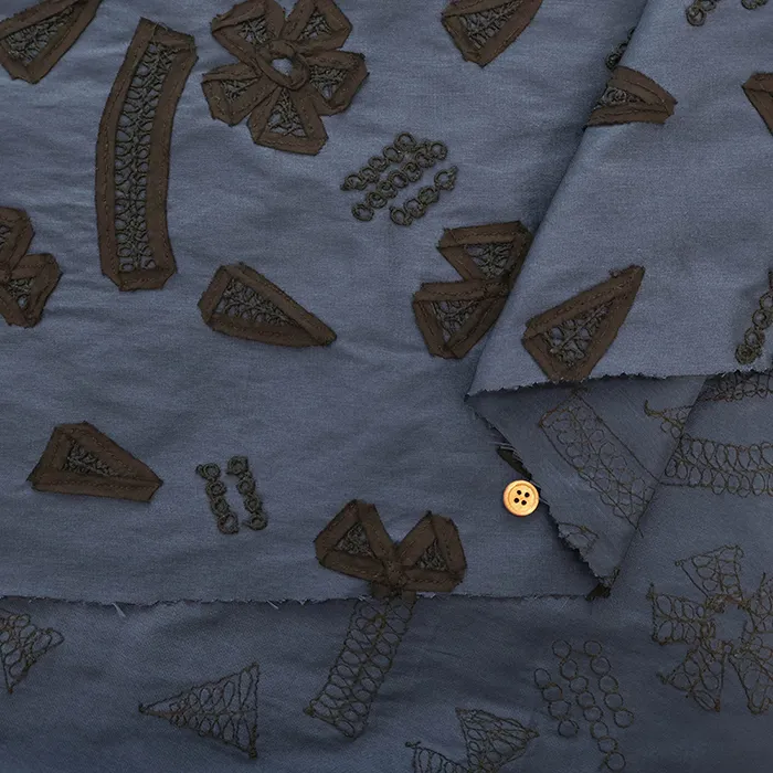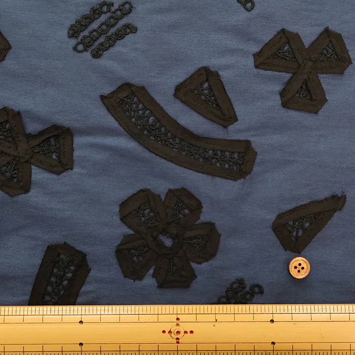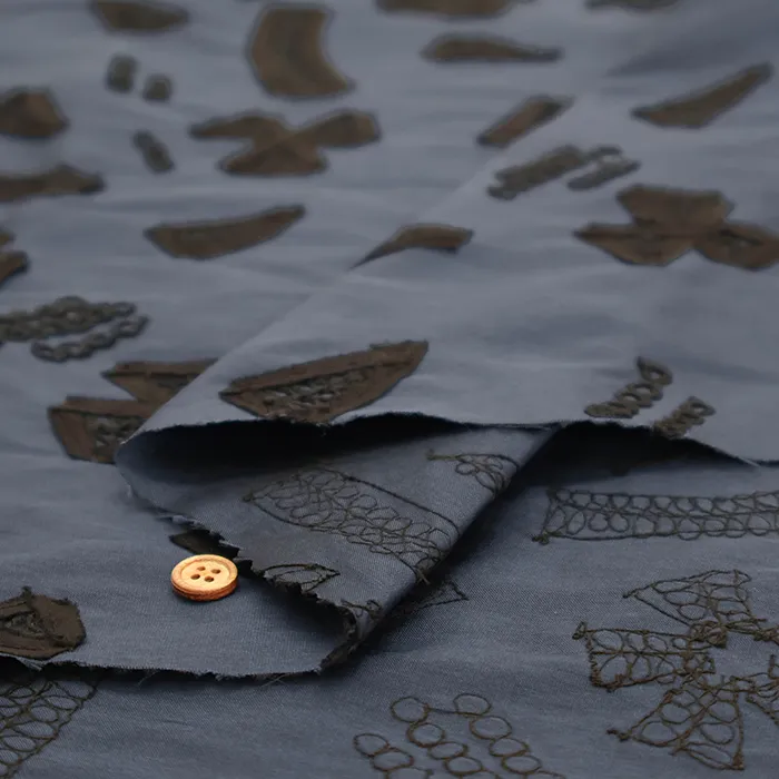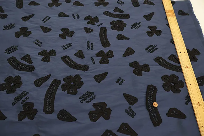 ハリ感のあるポリエステルの生地に、花やモチーフが刺繍されています。