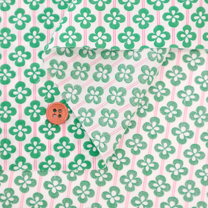 シンプルでありながら洗練されたこのデザインは、ストライプの背景に交互に並ぶ小さな様式化された花びらが特徴です。