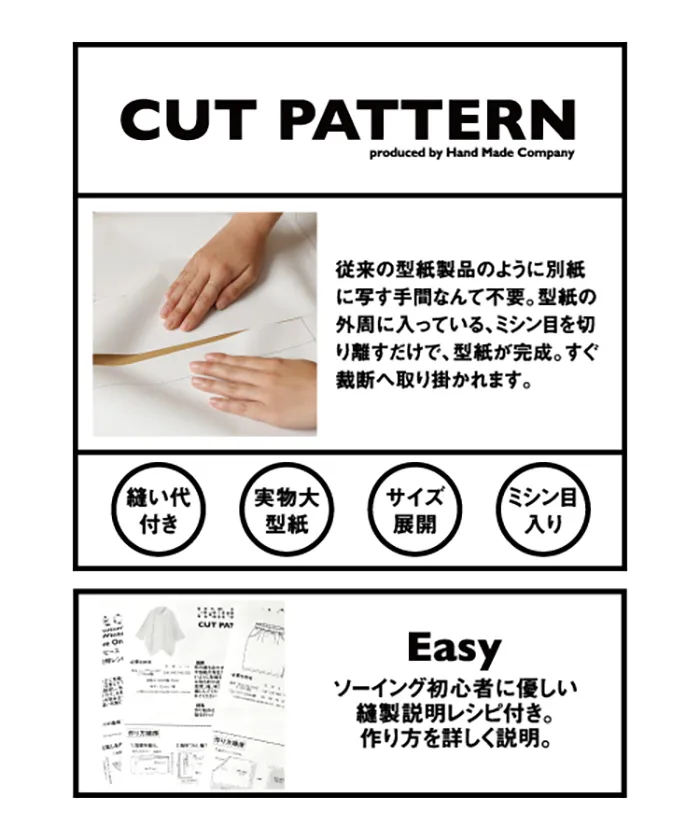 HANDMADE CLOSETは開封したら切り離すだけのCUT PATTERNを採用した洋裁用型紙です。型紙の外周に入っているミシン目を切り離すだけで、写し取る手間はなく、縫い代付きの型紙が完成します。