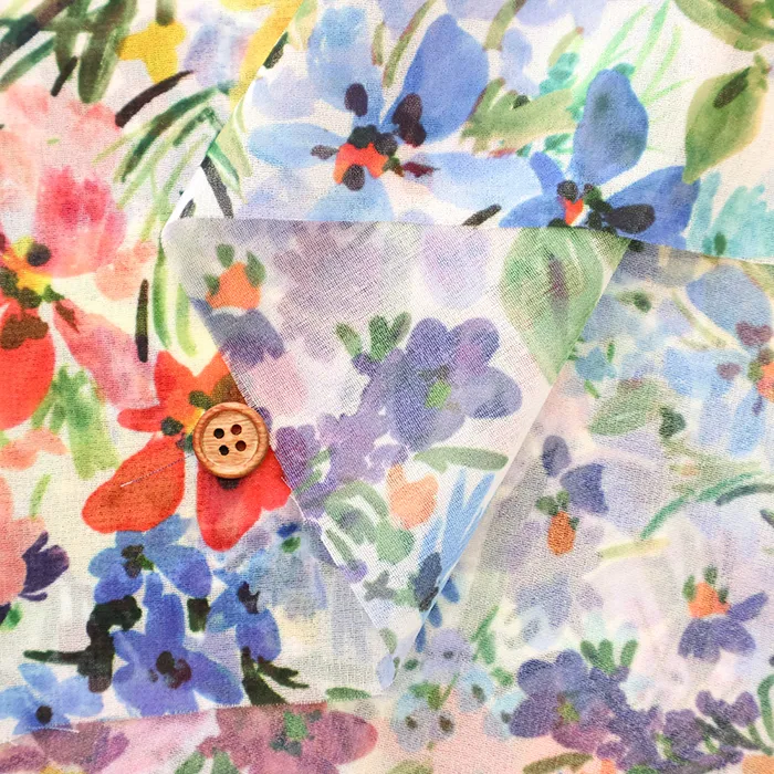 透け感があり、ドレープ性もあるシフォンジョーゼット素材に、鮮やかできれいな色合いが表現できるインクジェットプリントを使用した生地です。