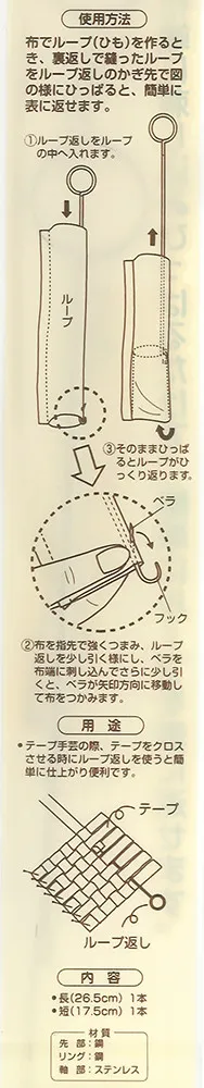 布でループ(ひも)を作る時、裏返しで縫ったループのループ返しのがぎ先で、引っ張ると簡単に表に返せる便利グッズです!