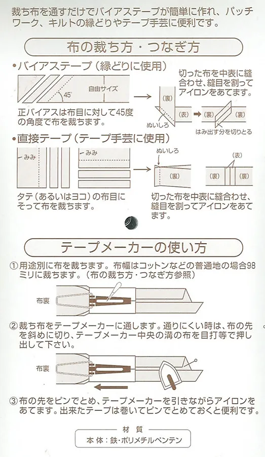 裁ち布を通すだけでバイアステープが簡単に作れ、パッチワークの図案づくりやテープ手芸に便利です。