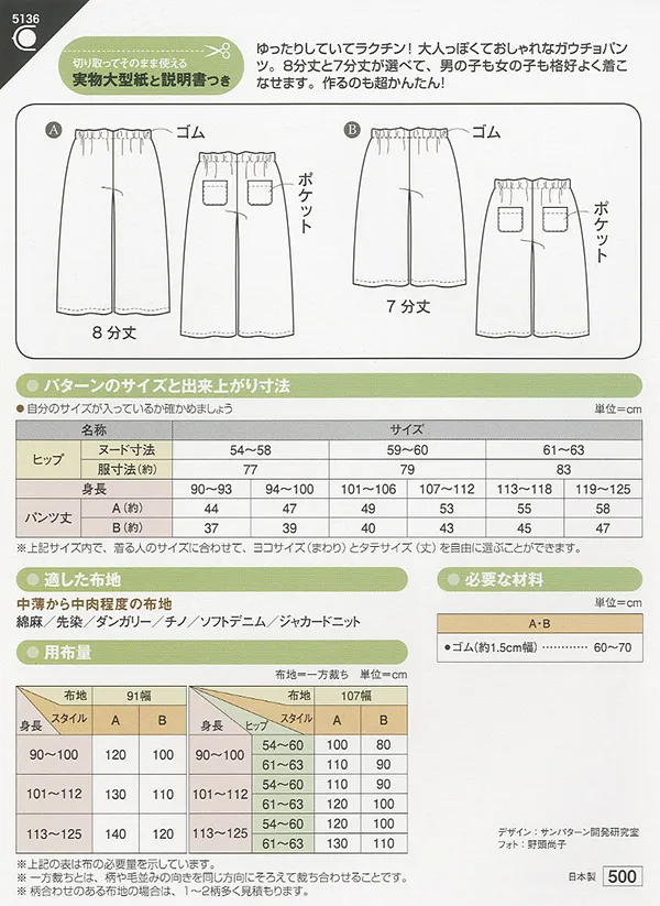 ゆったりとしていてラクチン!大人っぽくておしゃれなガウチョパンツ。8分丈と7分丈が選べて、男の子も女の子も格好よく着こなせます。作るのも簡単!