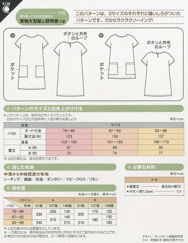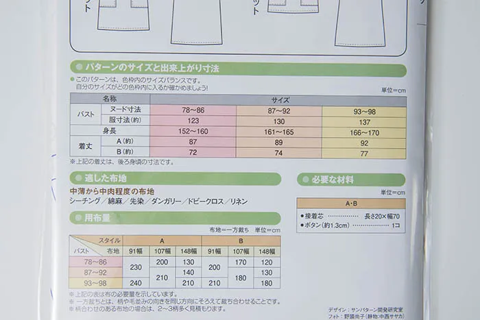 簡単ソーイングの型紙で、3サイズそれぞれに縫いしろがついた型紙です。