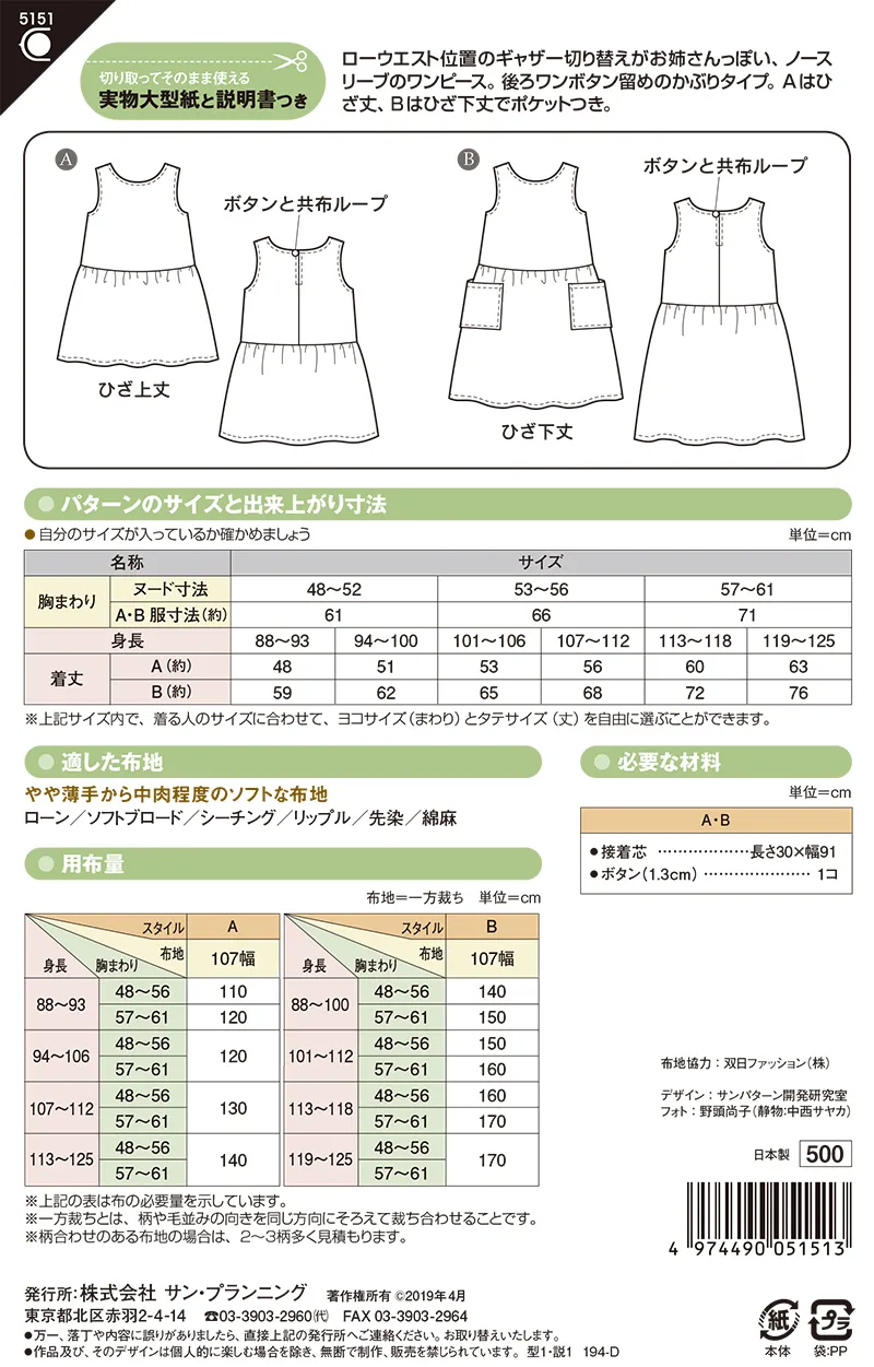 パターン 型紙 こどもローウエストワンピース