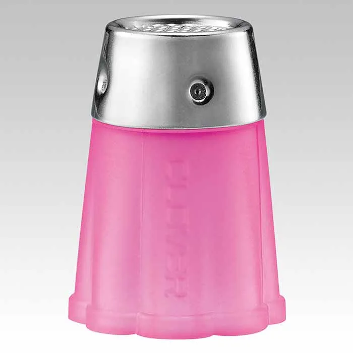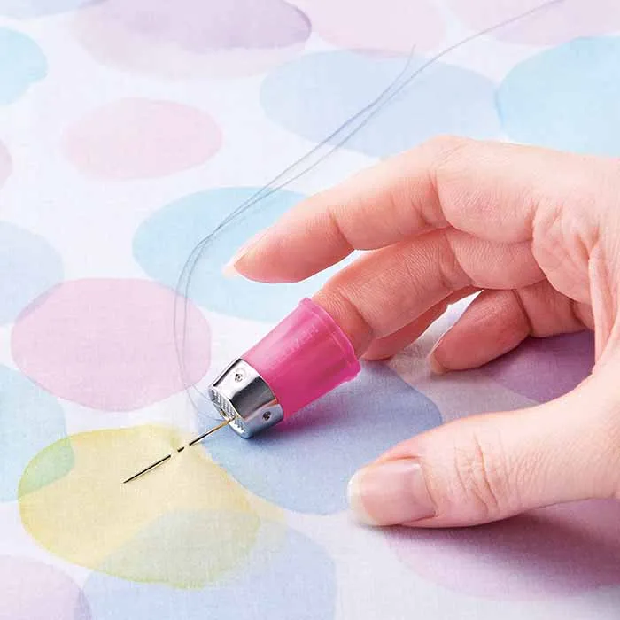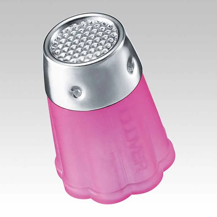 金属トップはディンプル(くぼみ)や縁があり、針が外れにくく、安心してしっかり押すことができます。金属製のシンブルに比べ、軽量です。