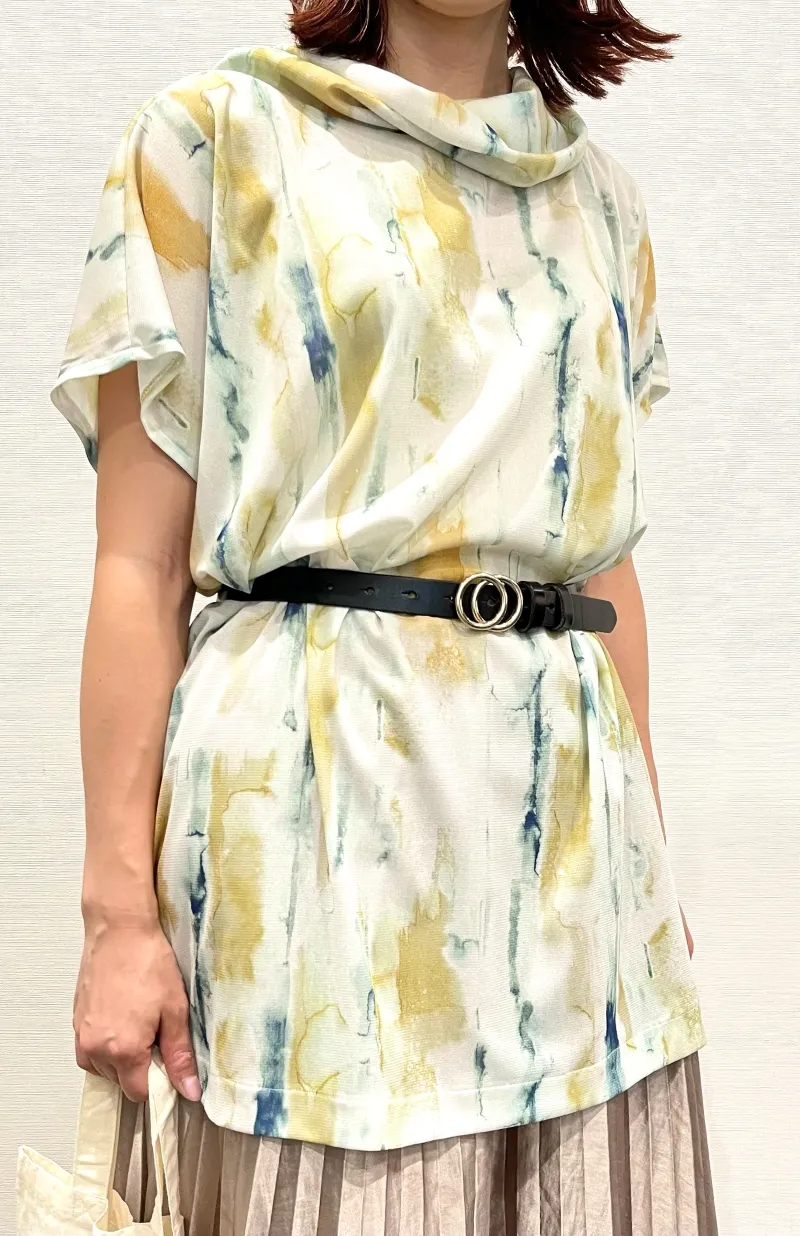 小顔見えするオフタートルの衿元とゆったりシルエットが、サッとかぶるだけで気になるラインをカバーするニット地専用のチュニック。