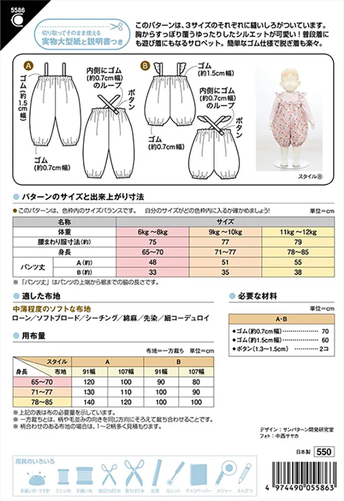 ゴム仕様で動きやすく、脱ぎ着もラクラク!3サイズ縫いしろつきで作るのもカンタン。