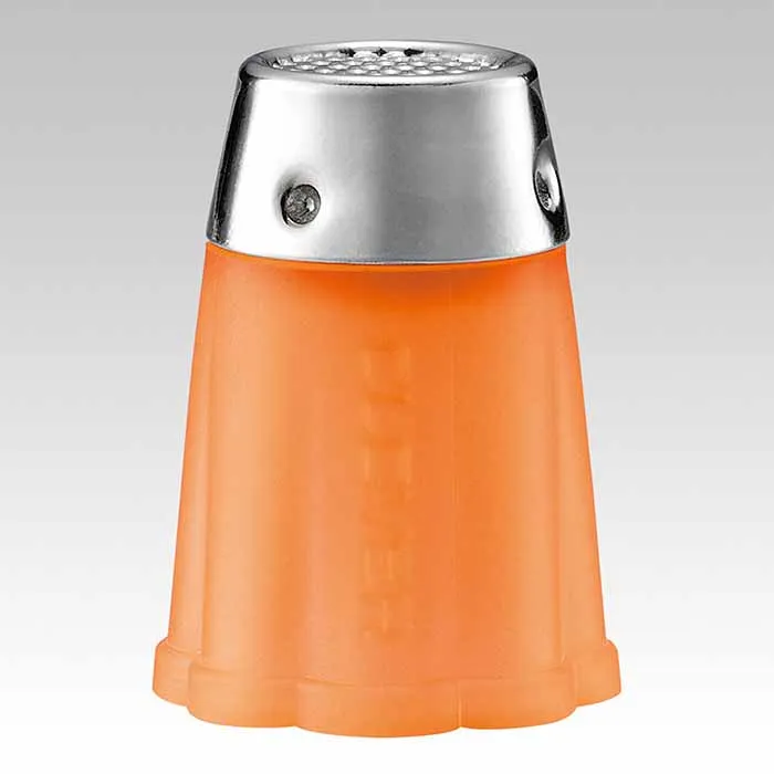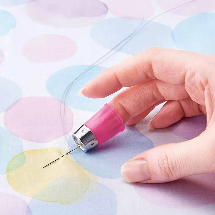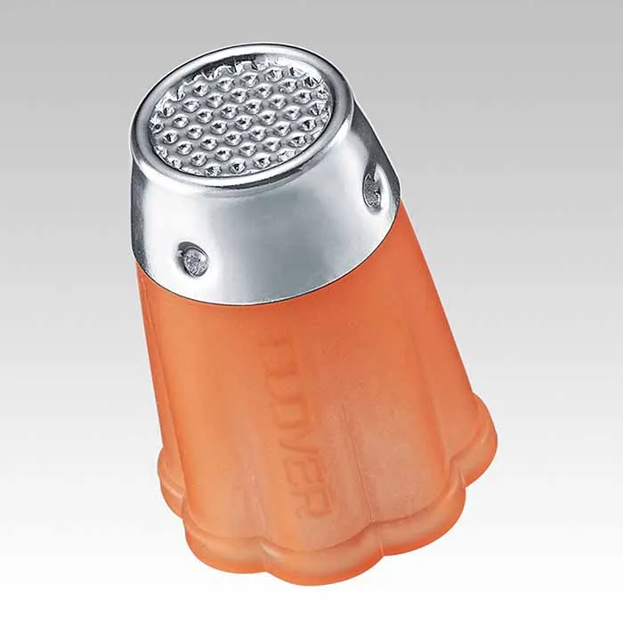 金属トップはディンプル(くぼみ)や縁があり、針が外れにくく、安心してしっかり押すことができます。金属製のシンブルに比べ、軽量です。