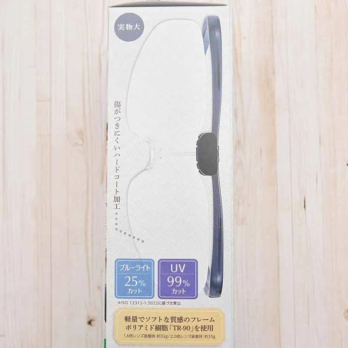 フレームは軽量でソフトな質感のポリアミド樹脂「TR-90」を使用。レンズは傷がつきにくいハードコート加工。ブルーライト25%カット、UV99%カット機能付。(※ISO 12312-1:2022に基づき算出)