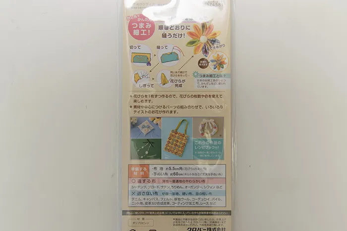 準備する材料:布地 約5.5cm角(花びら1枚あたり)、手縫い糸:約60cm(キルト糸などの丈夫な手縫い糸)