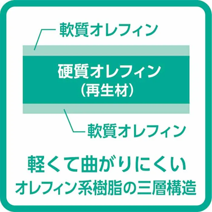 硬質オレフィン(再生材)を軟質オレフィンでサンドした、オレフィン系樹脂の三層構造。軽くて曲がりにくいです。