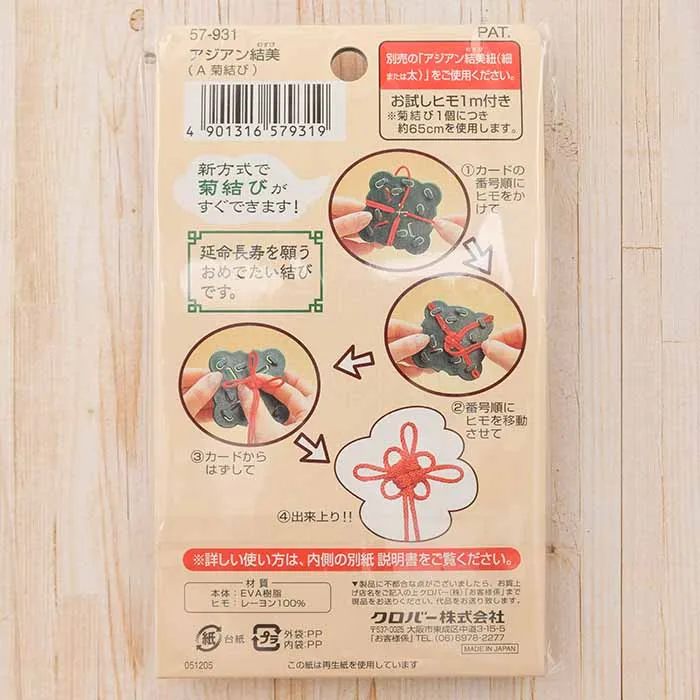 7枚の花びらが華やかな印象を与えます。パズルのようなゲーム感覚で飾り結びが楽しめます。おためしコード1メートルと説明書付。