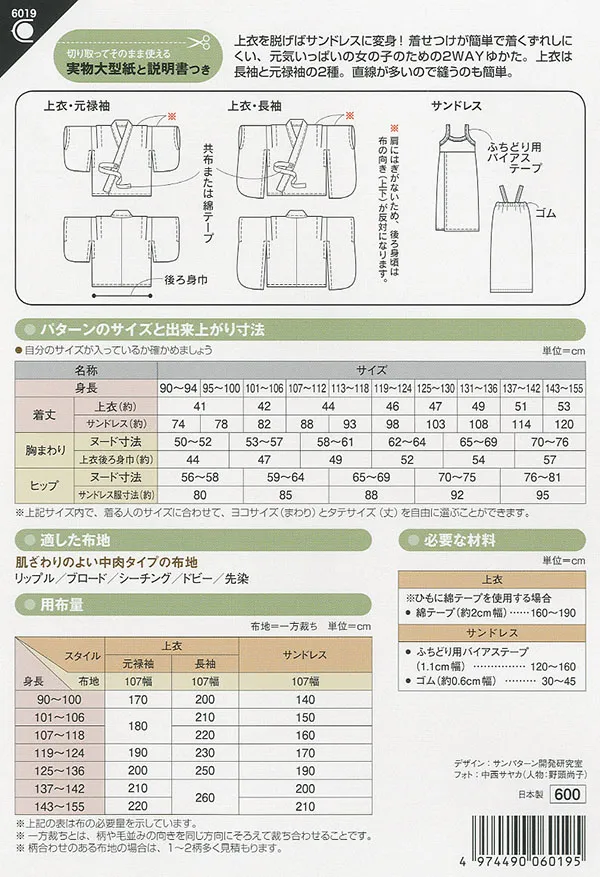 上衣は長袖と元禄袖の2種。直線が多いので縫うのも簡単。