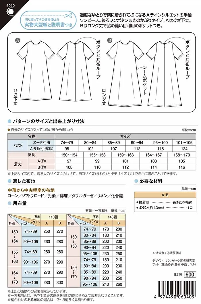 後ろワンボタンあきのかぶりタイプ。Aはひざ下丈。Bはロング丈で脇縫い目利用のポケットつき。