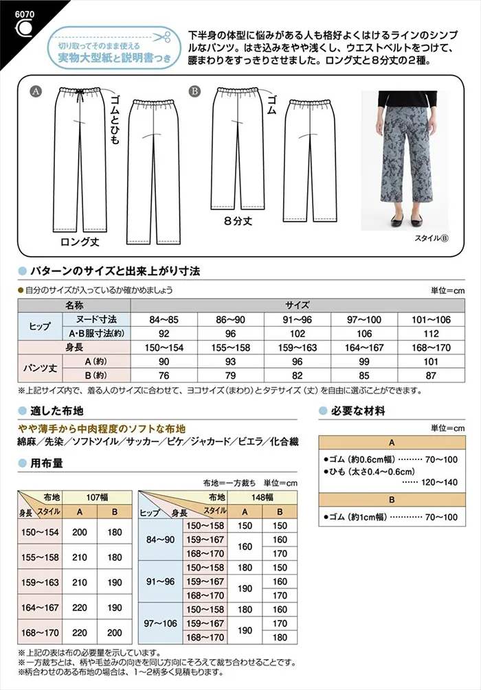 A はウエストにゴムとひもを通すロング丈。B は軽さのある8 分丈。