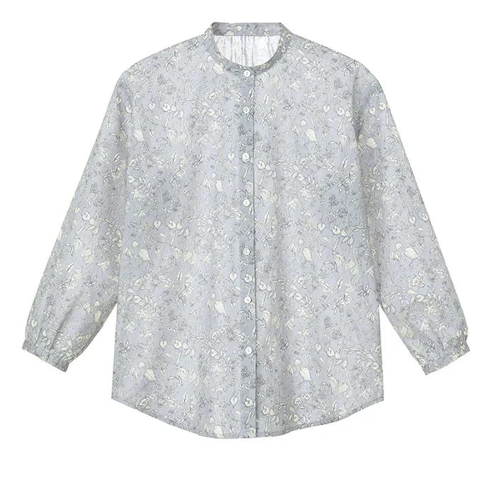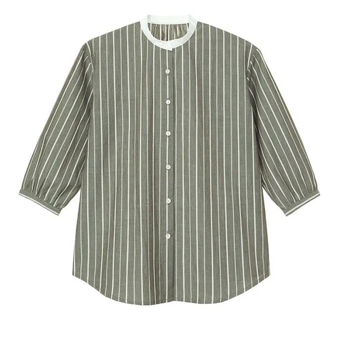 バンドカラーは男性が着るイメージが強いのですが、身幅と袖にややゆとりを持たせ、後ろ衿ぐりと袖口にギャザーを寄せ、マニッシュさを残しつつ女性らしい雰囲気を演出します。
