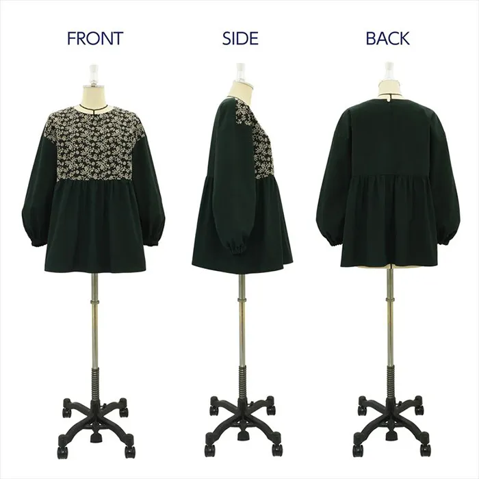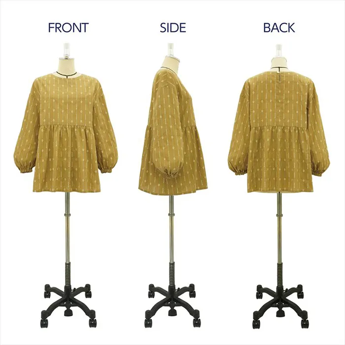 脚長効果のあるウエストより高い位置の切り替えに、ふんわりとギャザーを寄せたペプラムが気になるお腹や腰まわりをカバーするプルオンブラウス。