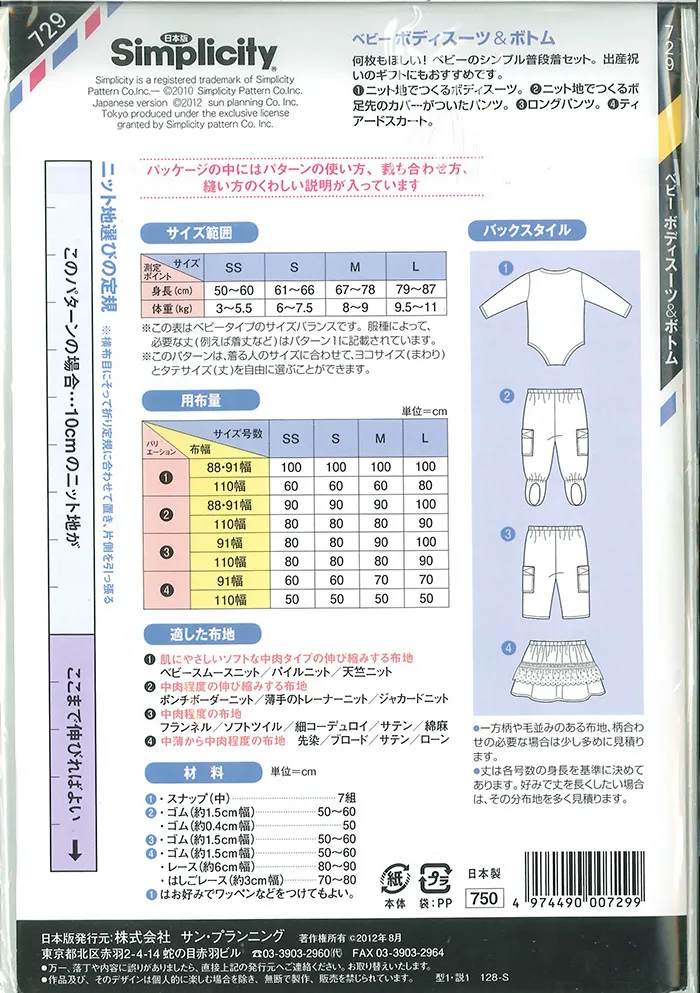 1はニット地でつくるボディースーツ。2はニット地で作る足先のカバーがついたパンツ。3はロングパンツ。4はティアードスカート