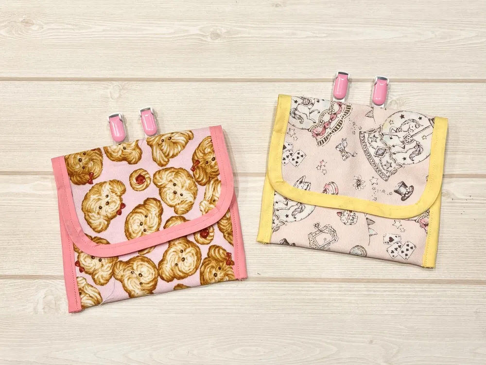 生地を挟み込み、重ねて縫うだけで簡単にふちどりができます。小さな袋物、マットのふちどりに。