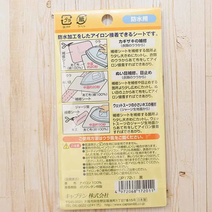 レインウェアーの目止め(縫い目の漏れ防止)、カギザキ、穴あきなどの補修・補強に。