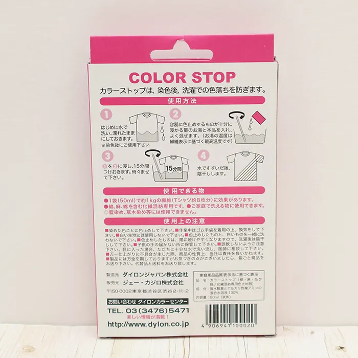 2.色止めする物が浸る容器にお湯(繊維表示に基づく最高温度)を注ぎ、カラーストップを入れ混ぜる。