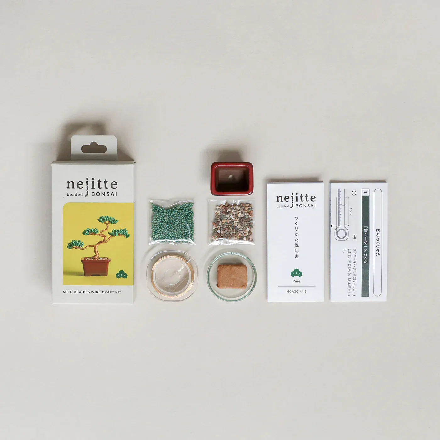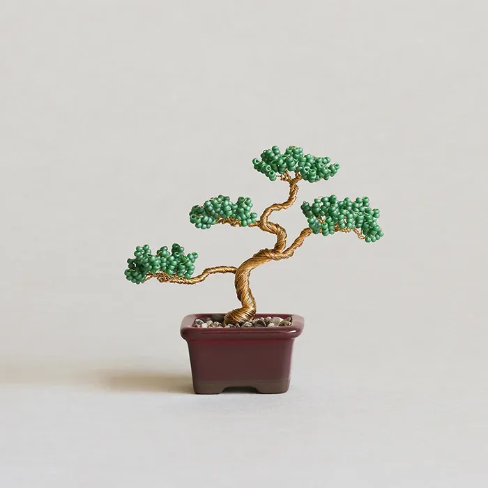 ビーズを通したワイヤーをねじって、小さな盆栽をつくるキット。