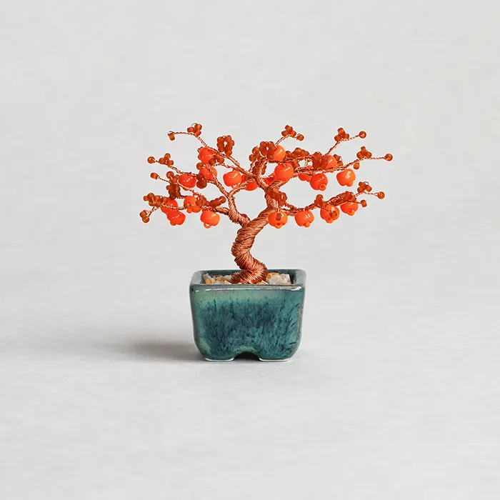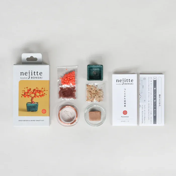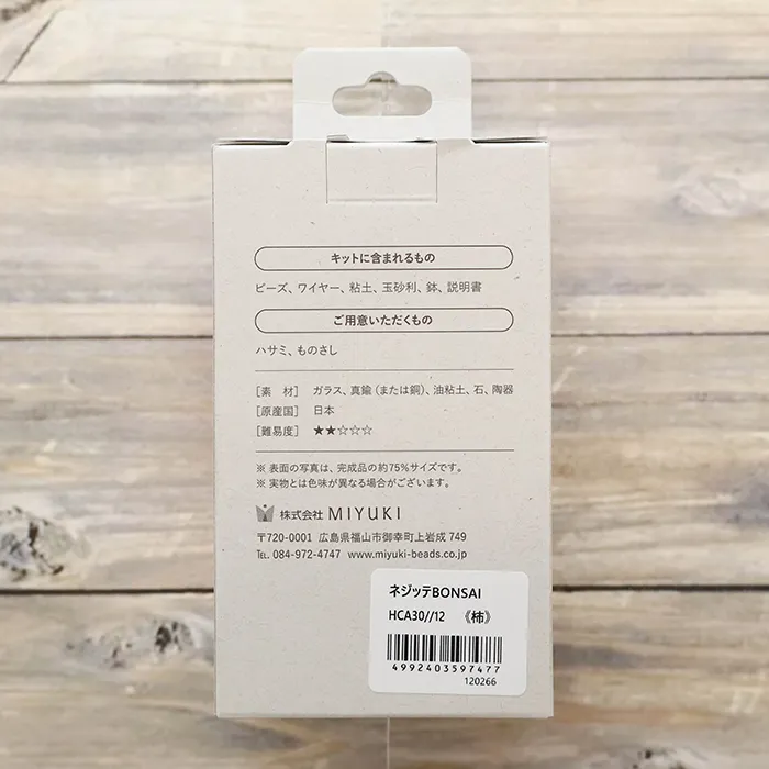 ビーズを通したワイヤーをねじって、小さな盆栽をつくるキット。