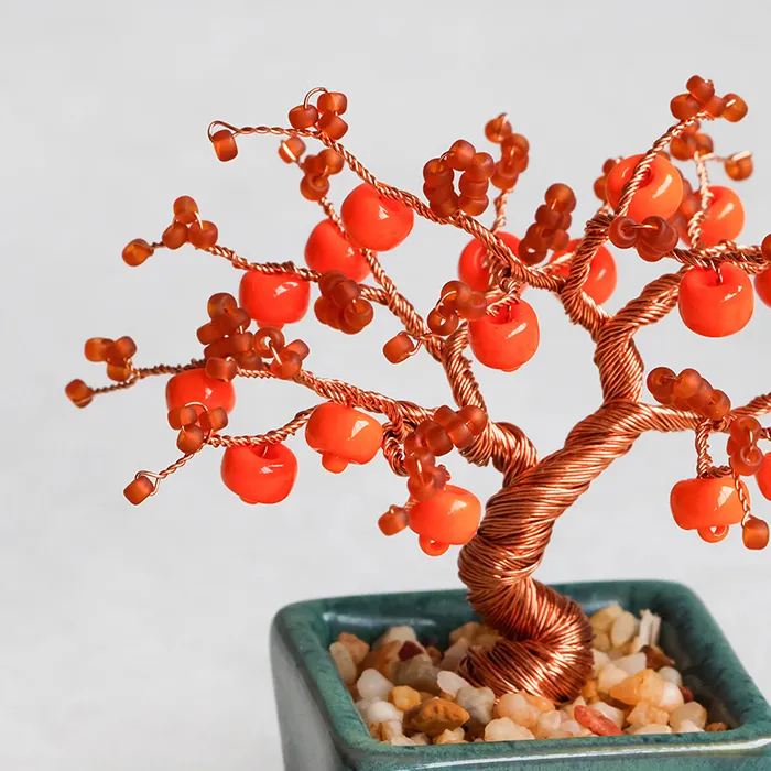 秋に橙色の実をつける柿は、健康や長寿の象徴とも言われます。枝先がしなるほどに実った果実を、色鮮やかな大粒のビーズで表現しています。