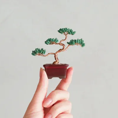 ビーズを通したワイヤーをねじって、小さな盆栽をつくるキット。