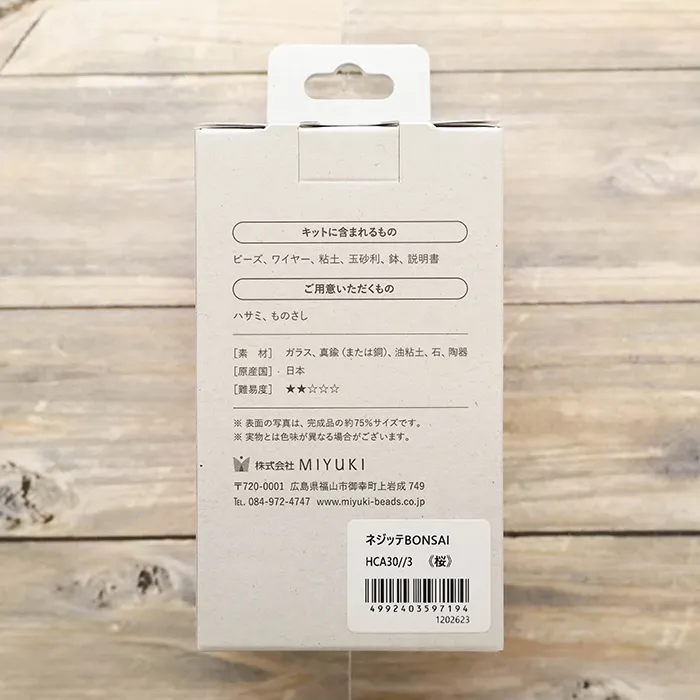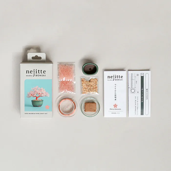 ビーズを通したワイヤーをねじって、小さな盆栽をつくるキット。