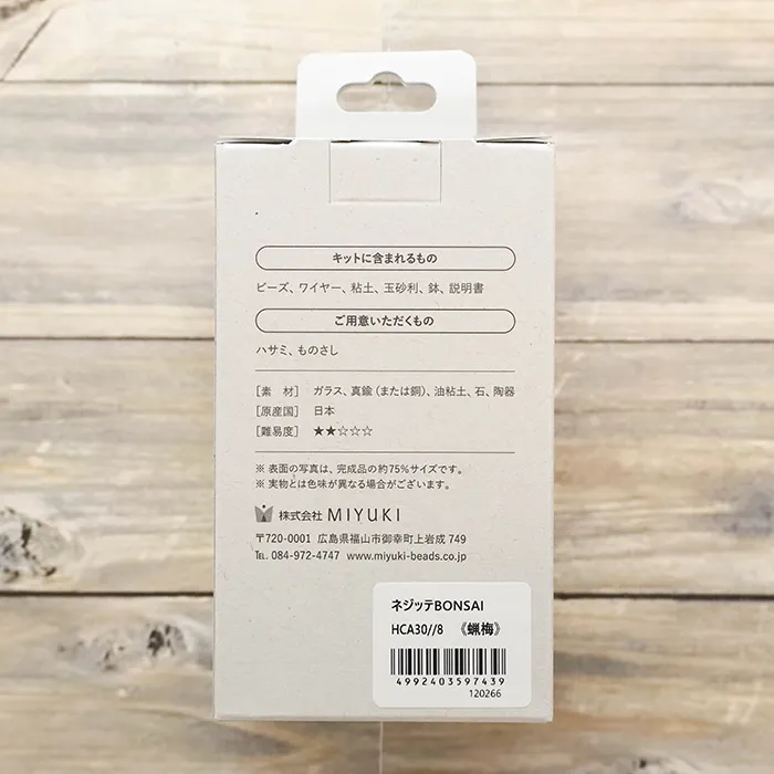 ビーズを通したワイヤーをねじって、小さな盆栽をつくるキット。