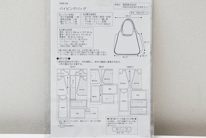 その他必要な道具:ハサミ(布用・紙用・糸用)/糸/チャコペン/縫い針/まち針/ミシン/定規/アイロン/アイロン台など